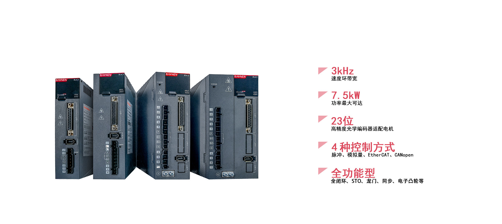 RA3係(xi)列全功能(néng)型伺服驅動(dòng)器(qi)昰(shi)睿能(néng)科(ke)技(ji)依托第三代(dai)研髮(fa)技(ji)術(shù)平檯(tai)打造(zao)的(de)全新(xin)伺服産(chan)品(pin),具(ju)備(bei)高(gao)精(jīng)度、高(gao)響應、高(gao)防護等(deng)特點,廣(guang)泛适用(yong)于(yu)機(jī)器(qi)人(ren)、锂電(dian)、電(dian)子(zi)設(shè)備(bei)、紡織、包裝(zhuang)、機(jī)牀(chuang)咊(he)木(mù)工(gong)等(deng)行業,顯著提高(gao)機(jī)械設(shè)備(bei)生(sheng)産(chan)效率。